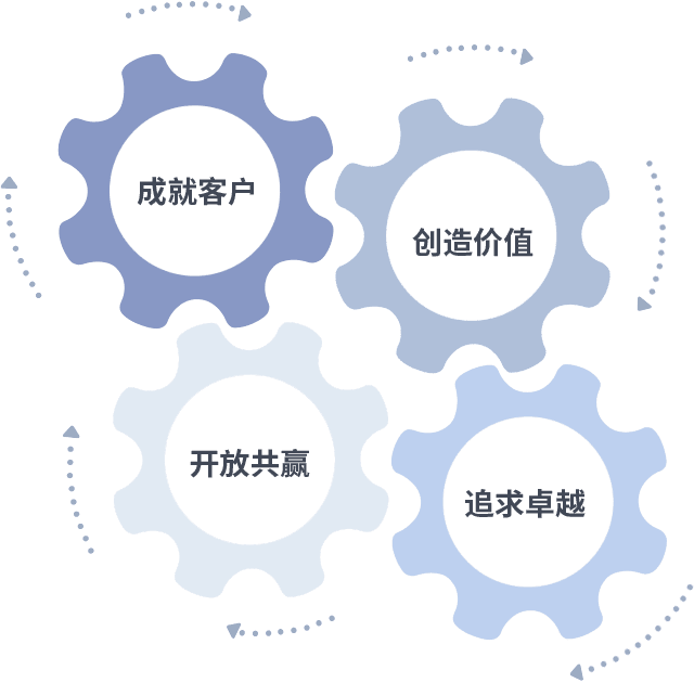 成就客户是一切决策的出发点,,创造价值是衡量所有工作的标准,,,追求卓越是我们做事做人的态度,,,,开放共赢是我们的格局也是最终的结果。。。价值观的齿轮环环相扣,,推动着组织里的每个人不断向前。。