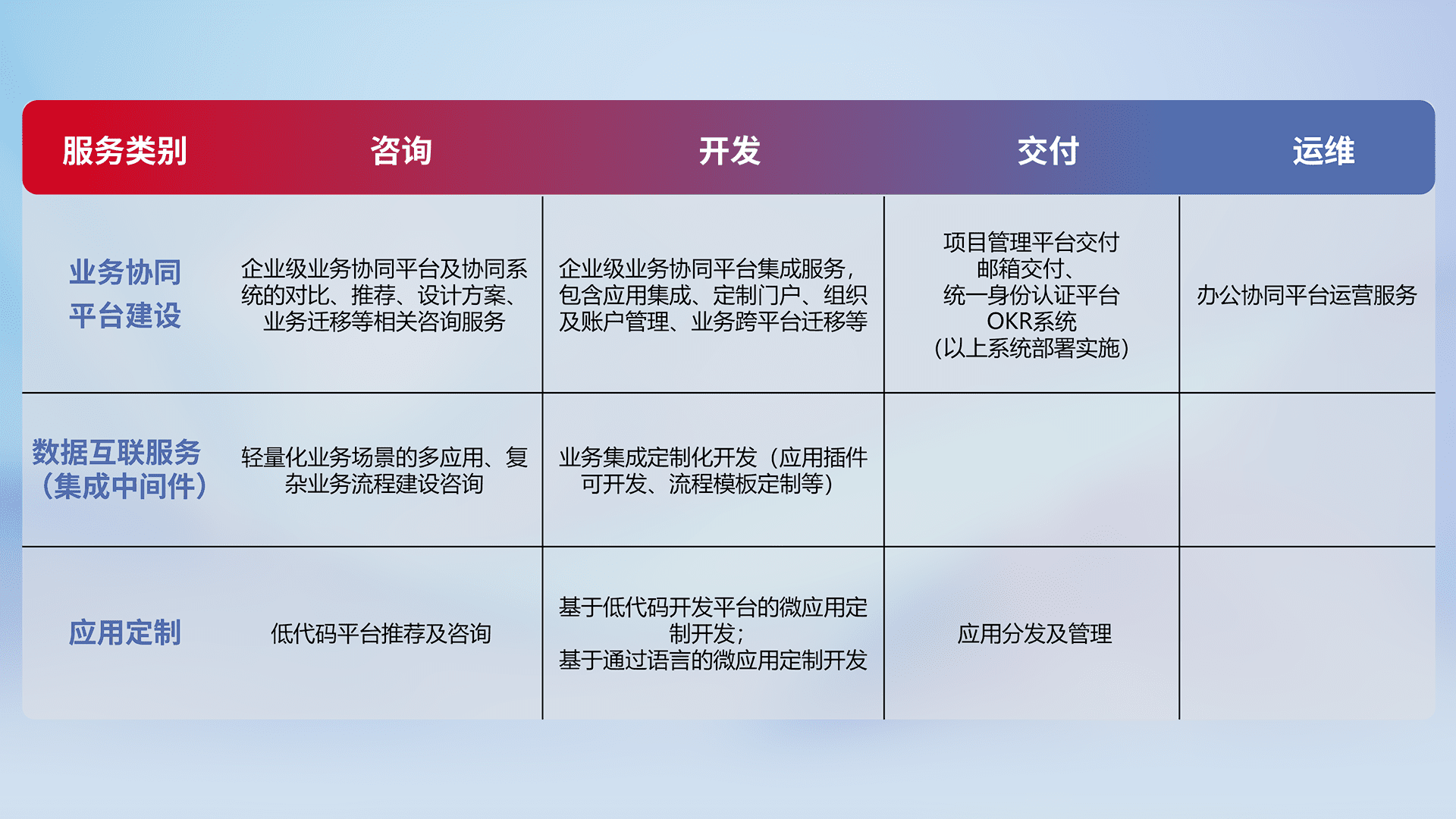 针对钉钉、、、企微、、、、IDaas等平台级产品提供产品的规划、、、、方案、、、、交付、、定制化开发等服务,,实现如统一协同办公、、、、智能客户服务、、、混合会议管理、、、、智能数据查询、、等业务场景,,,,实现数字化转型。。。。